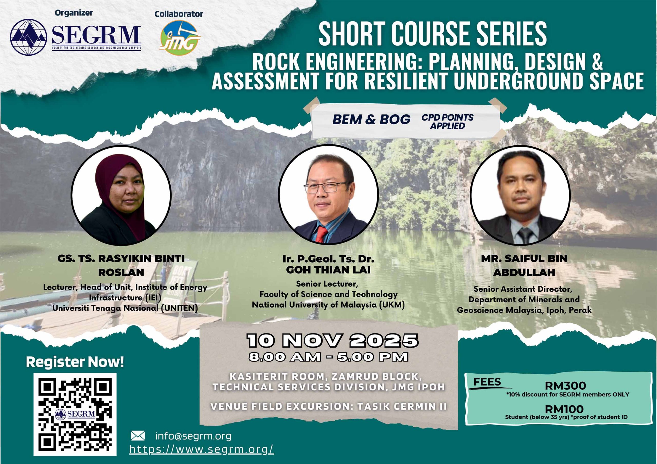 Join the Short Course Series on Rock Engineering: Planning, Design & Assessment for Resilient Underground Space, organized by the Society for Engineering Geology and Rock Mechanics Malaysia (SEGRM)! This one-day program features a technical sharing session followed by a field excursion, offering participants both theoretical insights and practical exposure to underground space development.
